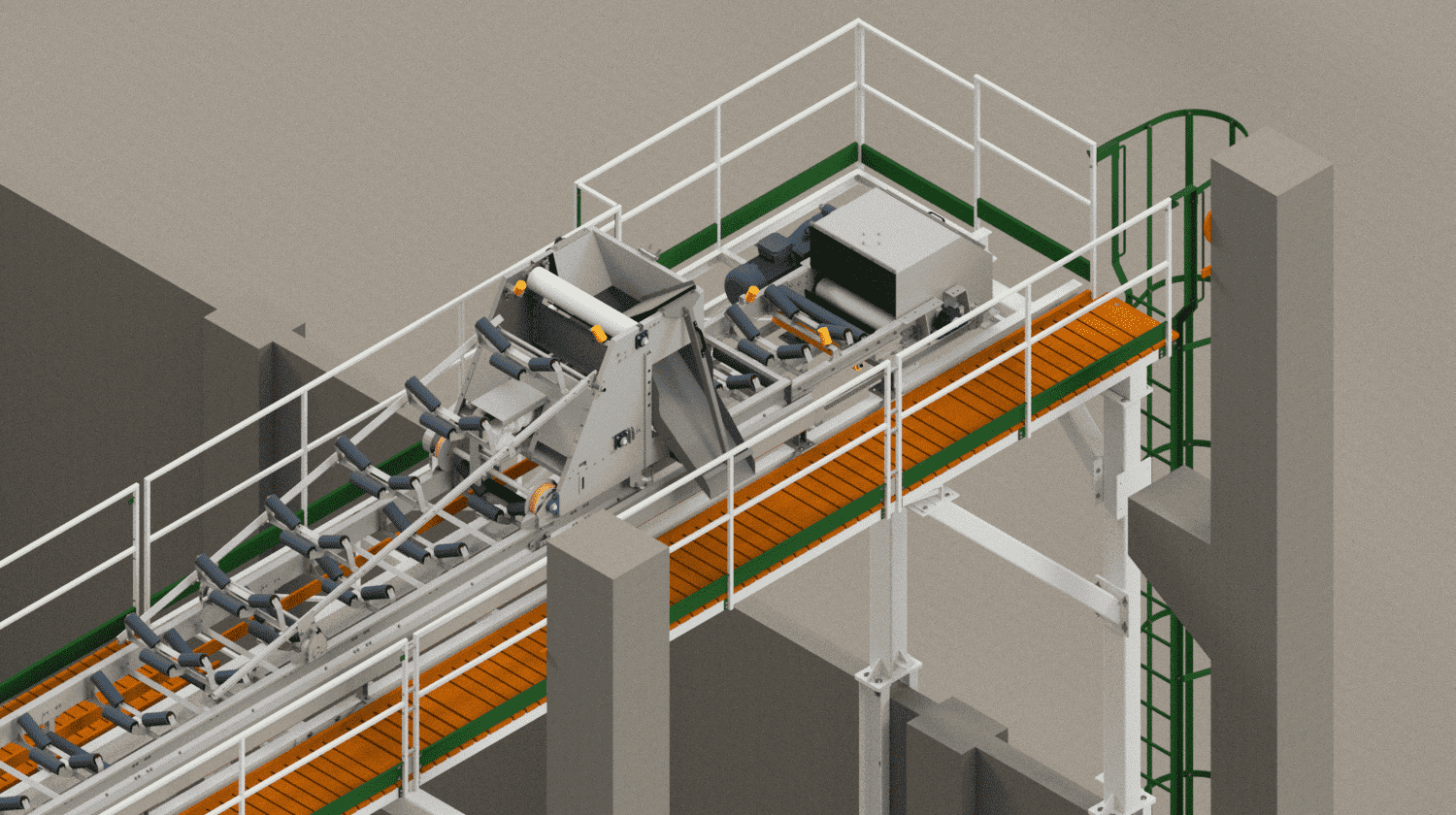 A belt tripper is used to “trip” the material off the conveyor at specified locations between the terminal pulleys.